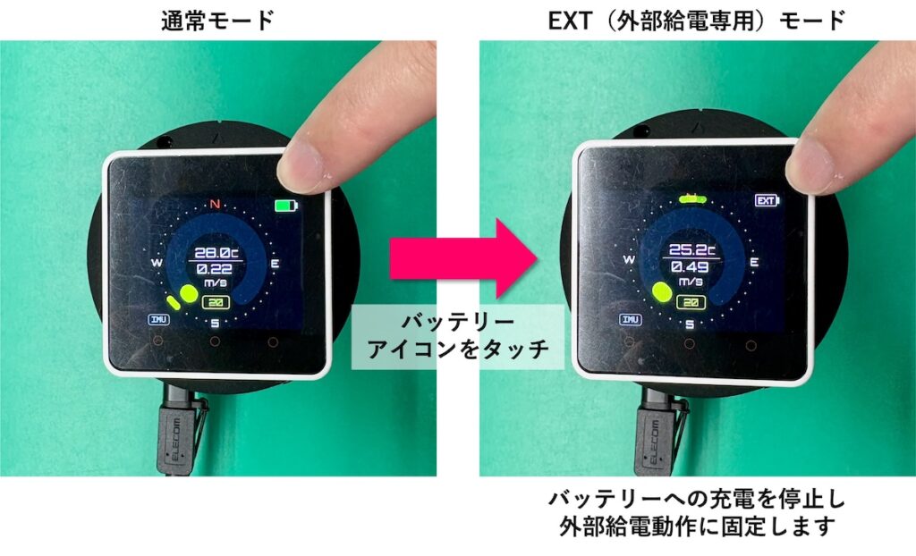 長時間計測を行う際には、ULSA本体下部microBポートから給電いただき、バッテリーアイコンをタッチしてEXTモードに変更するようにしてください。