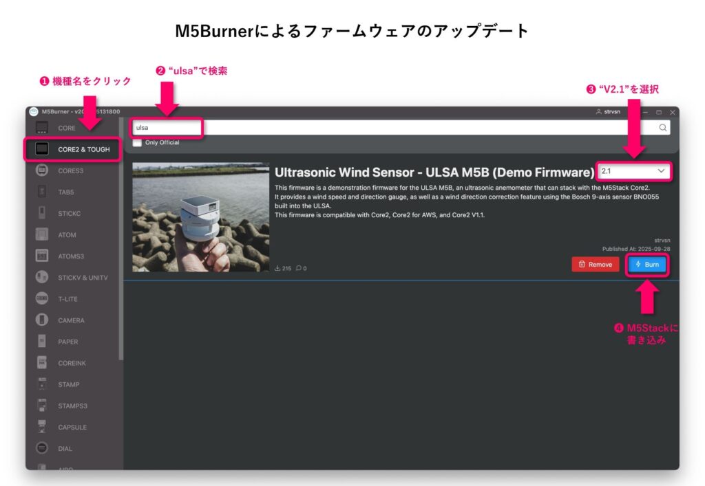 2024年8月に公開した上記のULSA M5BデモファームウェアV2.0について、2025年9月28日に不具合対応を行ったVer. 2.1のアップデートを行い、M5Bunerにて配信を開始しました。